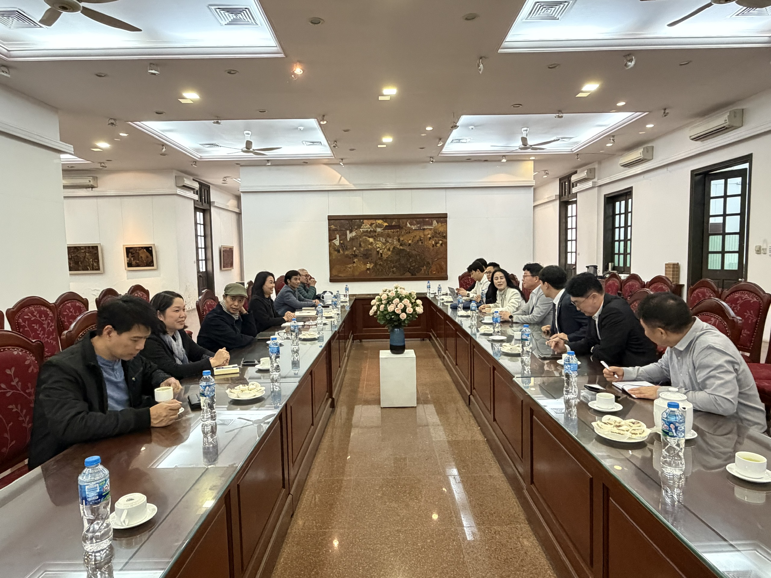 Tiếp đoàn Trường Đại học Chosun, về phía Trường Đại học Mỹ thuật Việt Nam có TS. Đặng Thị Phong Lan – Hiệu trưởng Nhà trường; PGS.TS. Nguyễn Nghĩa Phương – Phó Hiệu trưởng, cùng đại diện lãnh đạo các Khoa Hội họa, Đồ họa, Điêu khắc và Phòng Đào tạo, Quản lý khoa học và Hợp tác quốc tế. Buổi làm việc diễn ra trong không khí cởi mở, hợp tác, thể hiện tinh thần thiện chí và mong muốn tăng cường mối quan hệ song phương trên nền tảng tôn trọng và phát triển bền vững.