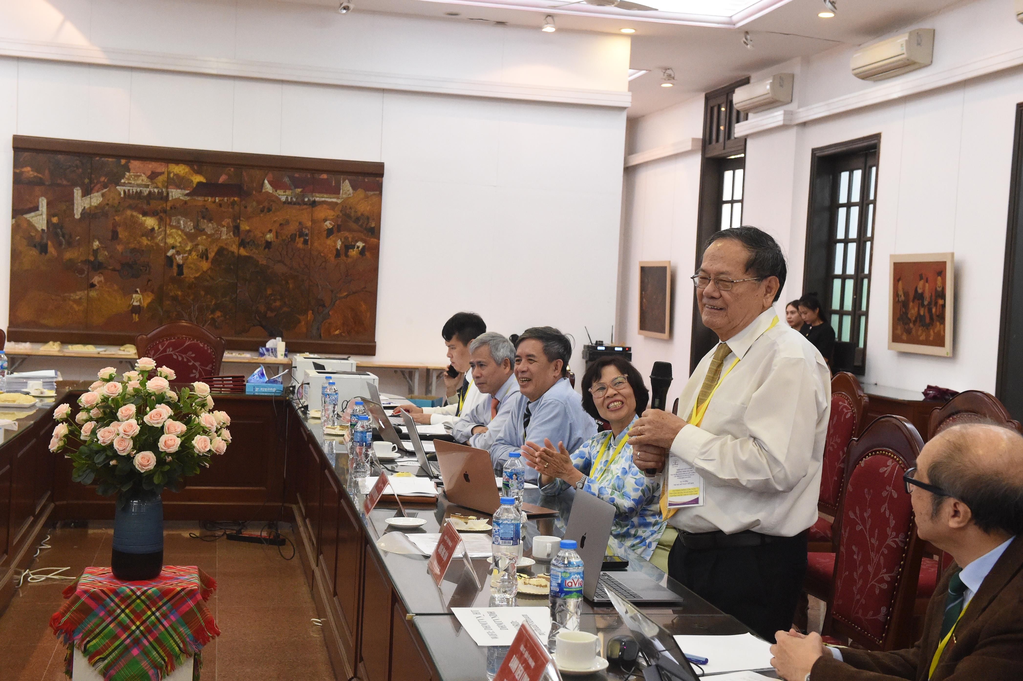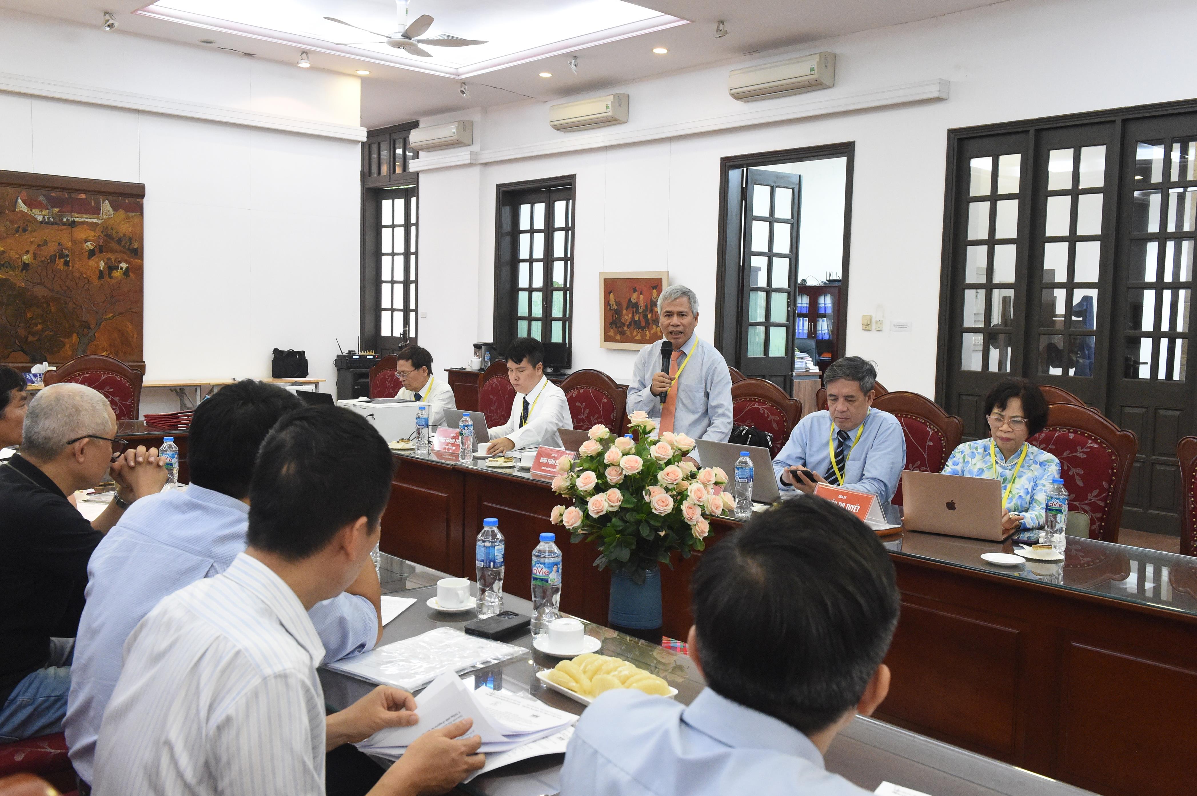 GS. TSKH. Đặng Ứng Vận, Nguyên Hiệu trưởng Trường ĐH Hòa Bình, Trưởng đoàn ĐGN các chương trình đào tạo tại Trường Đại học Mỹ thuật Việt Nam thông báo về kế hoạch làm việc cụ thể của đợt khảo sát, đồng thời động viên hội đồng tự đánh giá của Nhà trường tiếp tục bổ sung đầy đủ minh chứng.