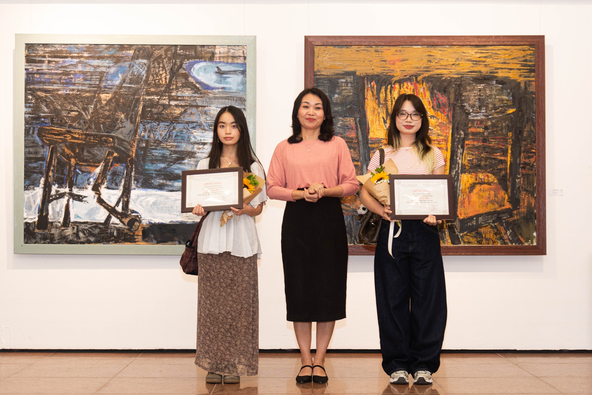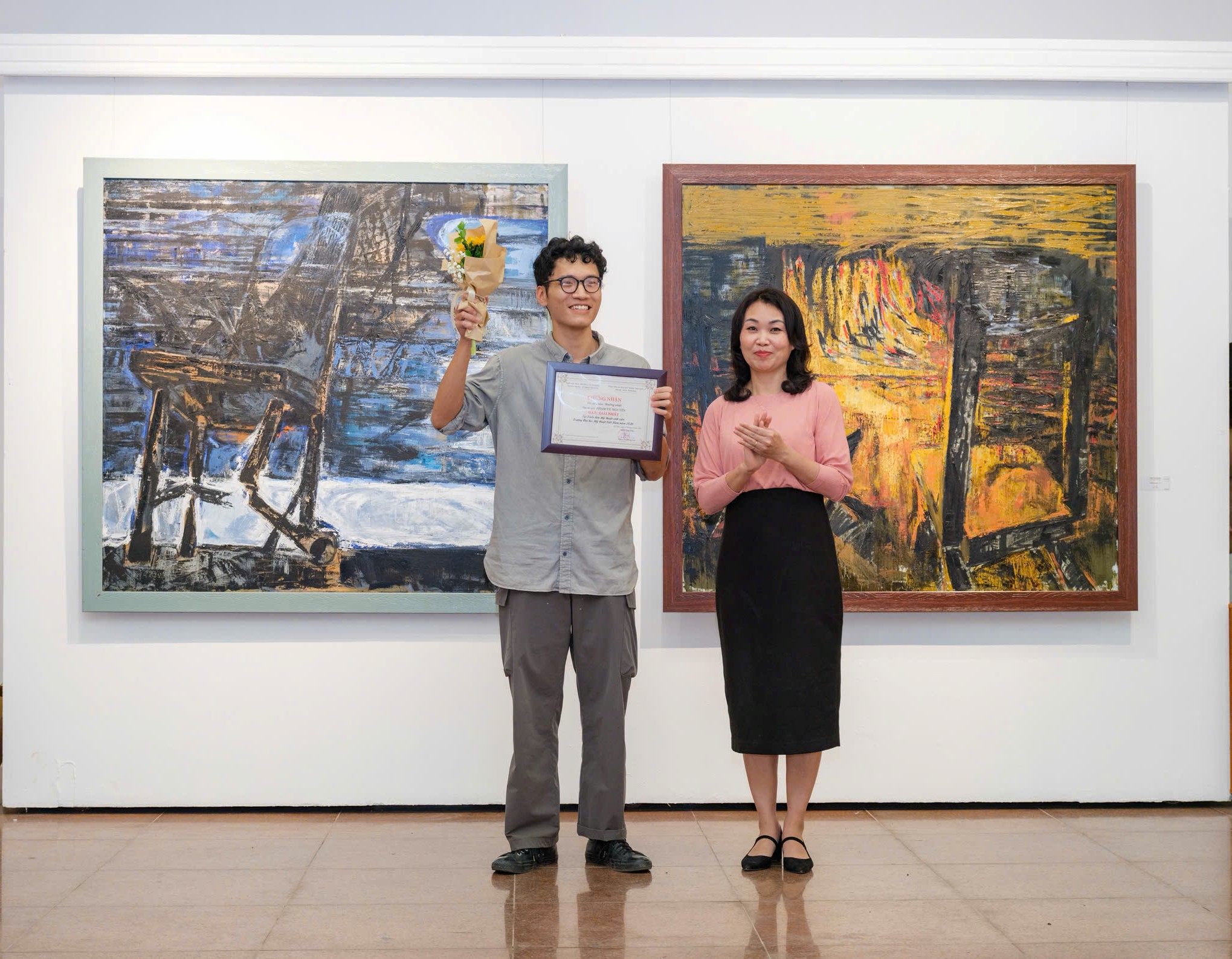 TS. Đặng Thị Phong Lan, Phó Bí thư Đảng ủy, Hiệu trưởng trao Giải Nhất cho tác giả Phạm Vũ Nguyên, Lớp Hội họa K65 Sơn dầu.