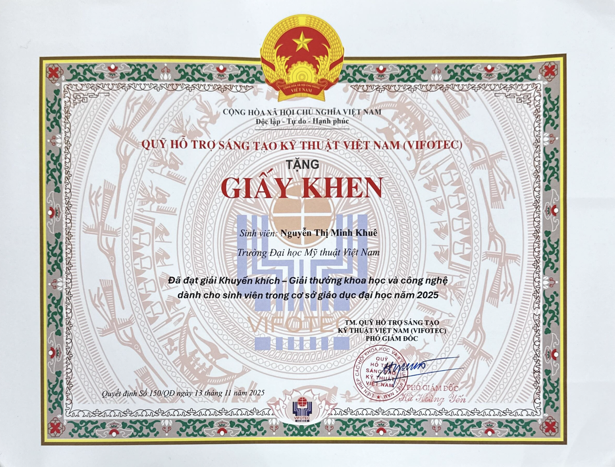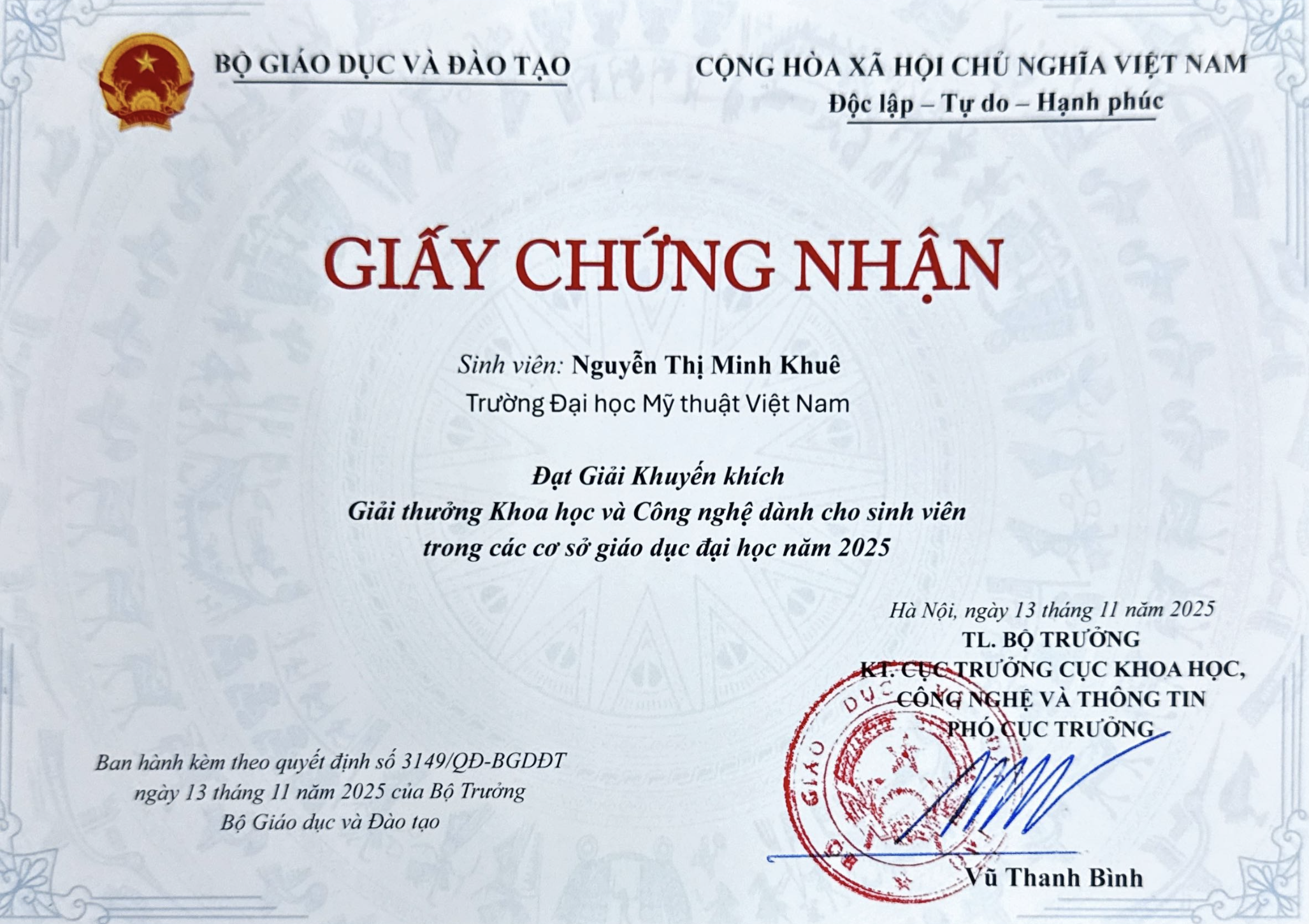 Đây là kết quả đáng khích lệ, thể hiện chất lượng đào tạo gắn với nghiên cứu khoa học của Nhà trường, đồng thời khẳng định năng lực sáng tạo, tư duy nghiên cứu nghiêm túc của sinh viên Trường Đại học Mỹ thuật Việt Nam trong bối cảnh nghệ thuật đương đại và chuyển đổi số.