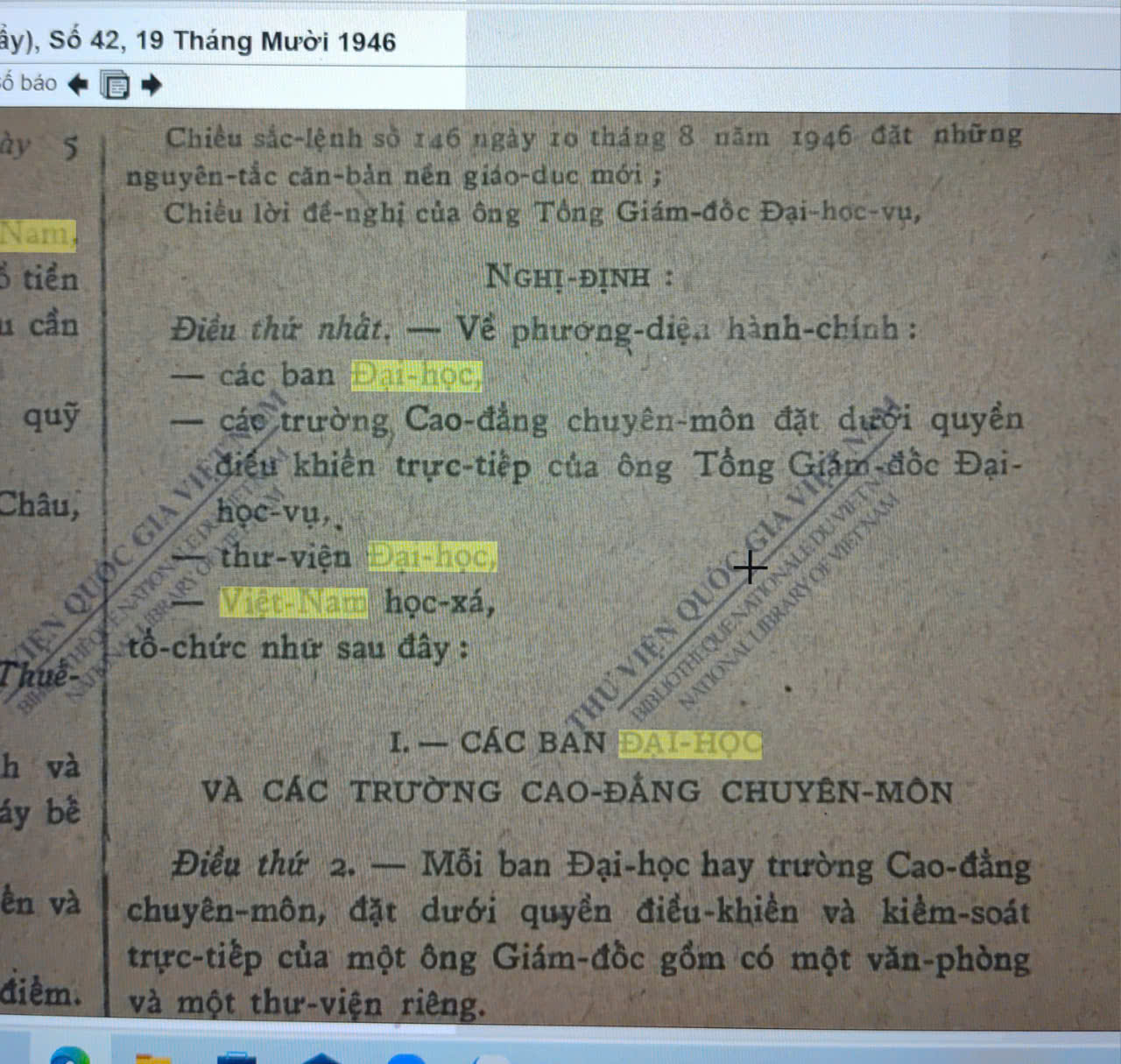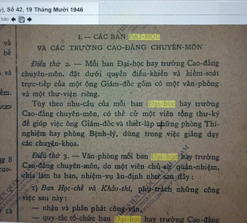 Điều thứ 2. – Mỗi ban Đại học hay trường Cao đẳng chuyên môn đặt dưới quyền điều khiển và kiểm soát trực tiếp của một ông Giám đốc gồm có một văn phòng và một thư viện riêng.