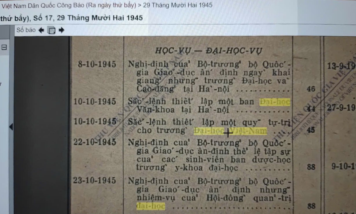 “Trong phiên họp ngày 22/9/1945, tức là chỉ vừa tròn 20 ngày sau Lễ Tuyên ngôn độc lập, Hội đồng Chính phủ đã thảo luận về vệc “mở cửa” trường đại học. Những dòng sau đây được chúng tôi sao lục nguyên văn từ