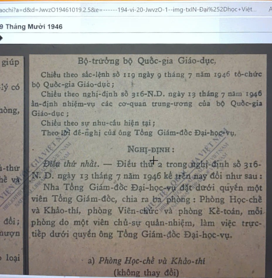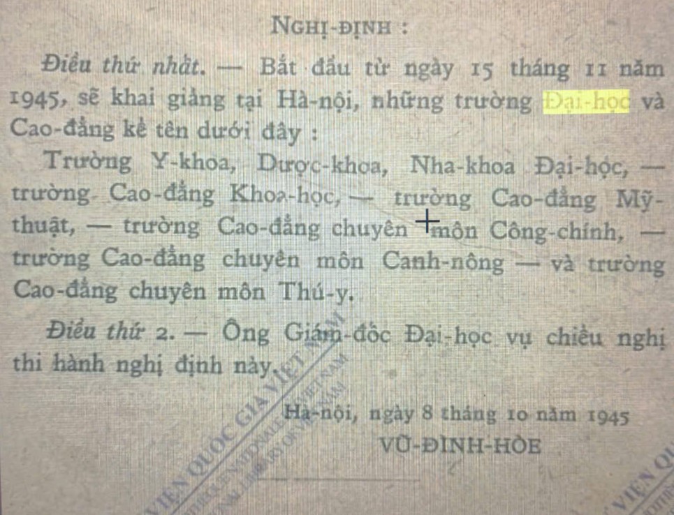 Đại học Việt Nam xuất hiện chính thức trong Sắc lệnh ngày 10 tháng 10 năm 1945 “thiết lập một quỹ tự trị cho trường Đại học Việt Nam” (H. 10).