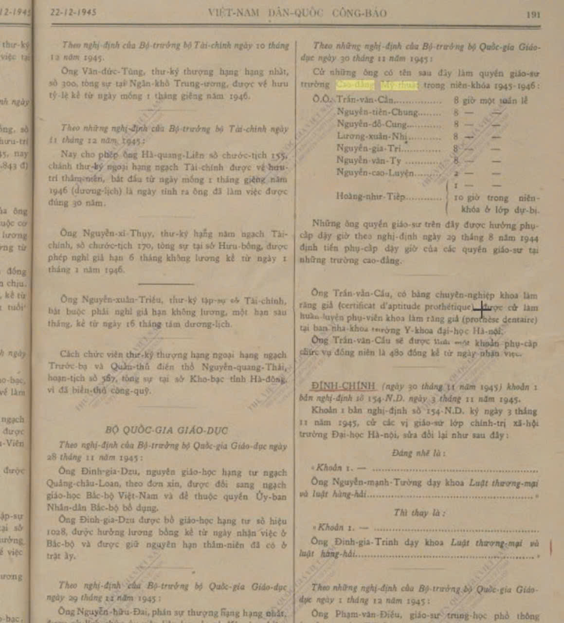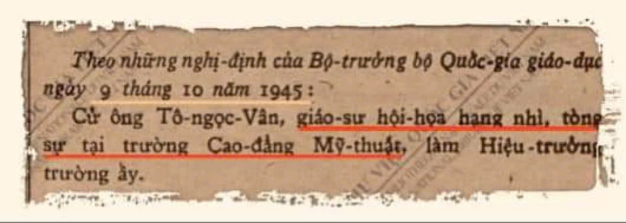 - Theo Nghị định ngày 30 tháng 11 năm 1945 bổ nhiệm nhân sự giảng dạy tại trường Cao đẳng Mỹ thuật năm học 1945-1946 (H. 6); và thông tin bổ nhiệm hoạ sĩ Tô Ngọc Vân làm Hiệu trưởng trường Cao đẳng Mỹ thuật (H. 5).