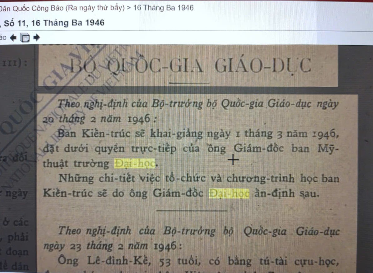 Như vậy có thể thấy cách gọi /cách viết “giáo sư ban Mỹ thuật trường Đại học” của văn bản bổ nhiệm Hội đồng quản trị đại học chiếu theo Nghị định ngày 31 tháng 12 năm 1945, và văn bản thông báo ngày khai giảng Ban Kiến trúc “đặt dưới quyền trực tiếp của ông Giám đốc ban Mỹ thuật trường Đại học” (H. 8) theo Nghị định ngày 20 tháng 2 năm 1946 cùng của Bộ Quốc gia Giáo dục, là nguyên nhân dẫn đến cách hiểu trường Mỹ thuật (ban Mỹ thuật đại học)