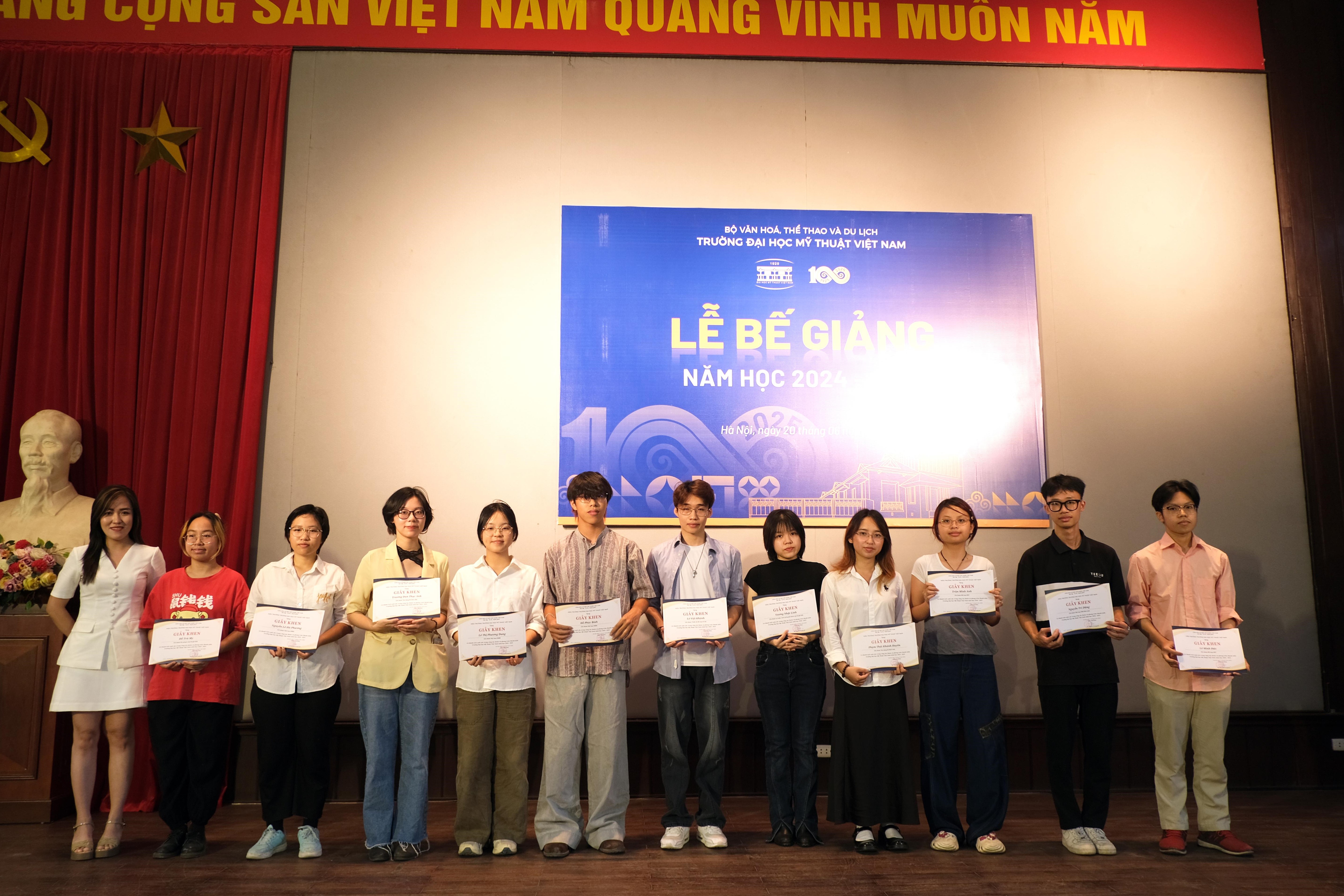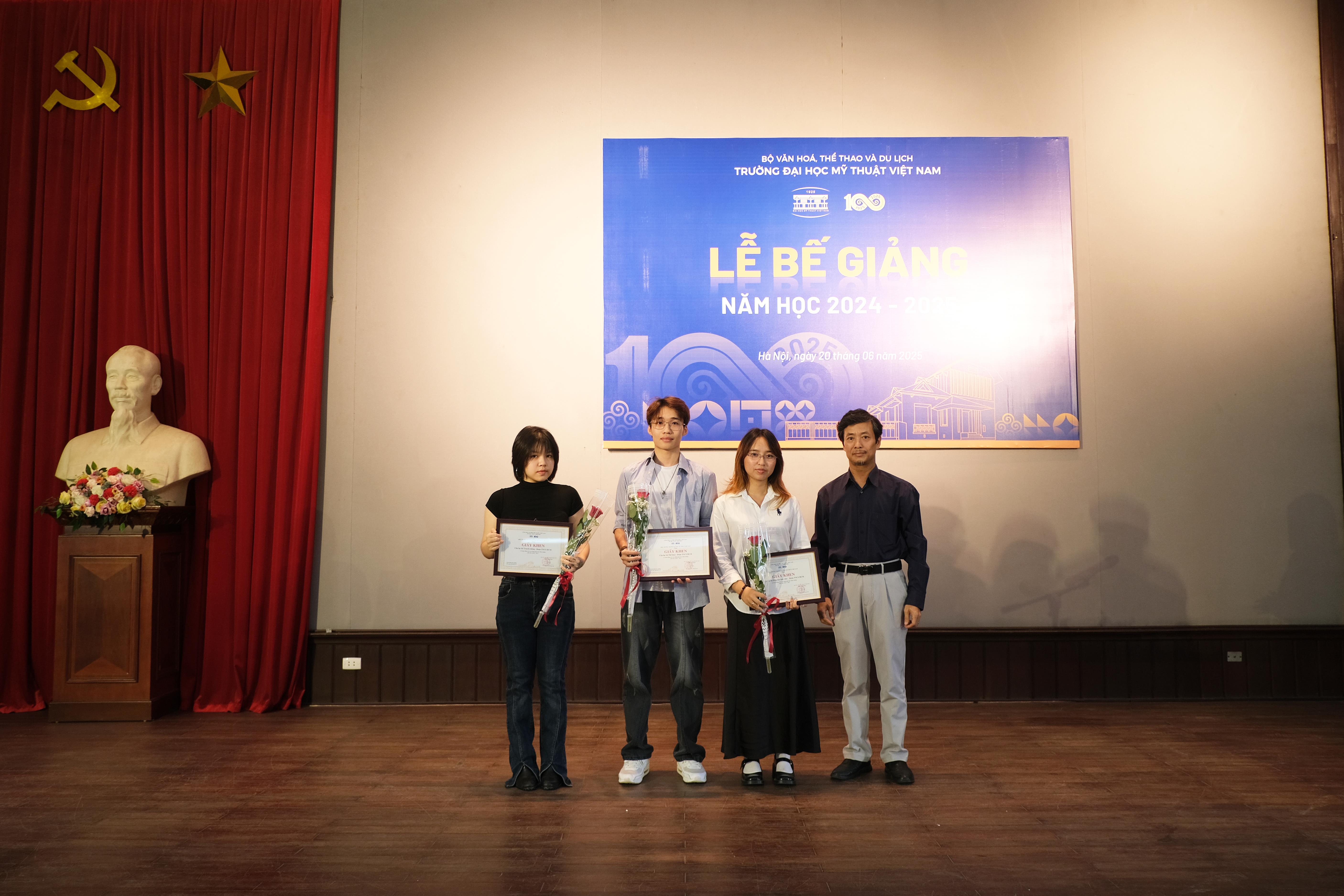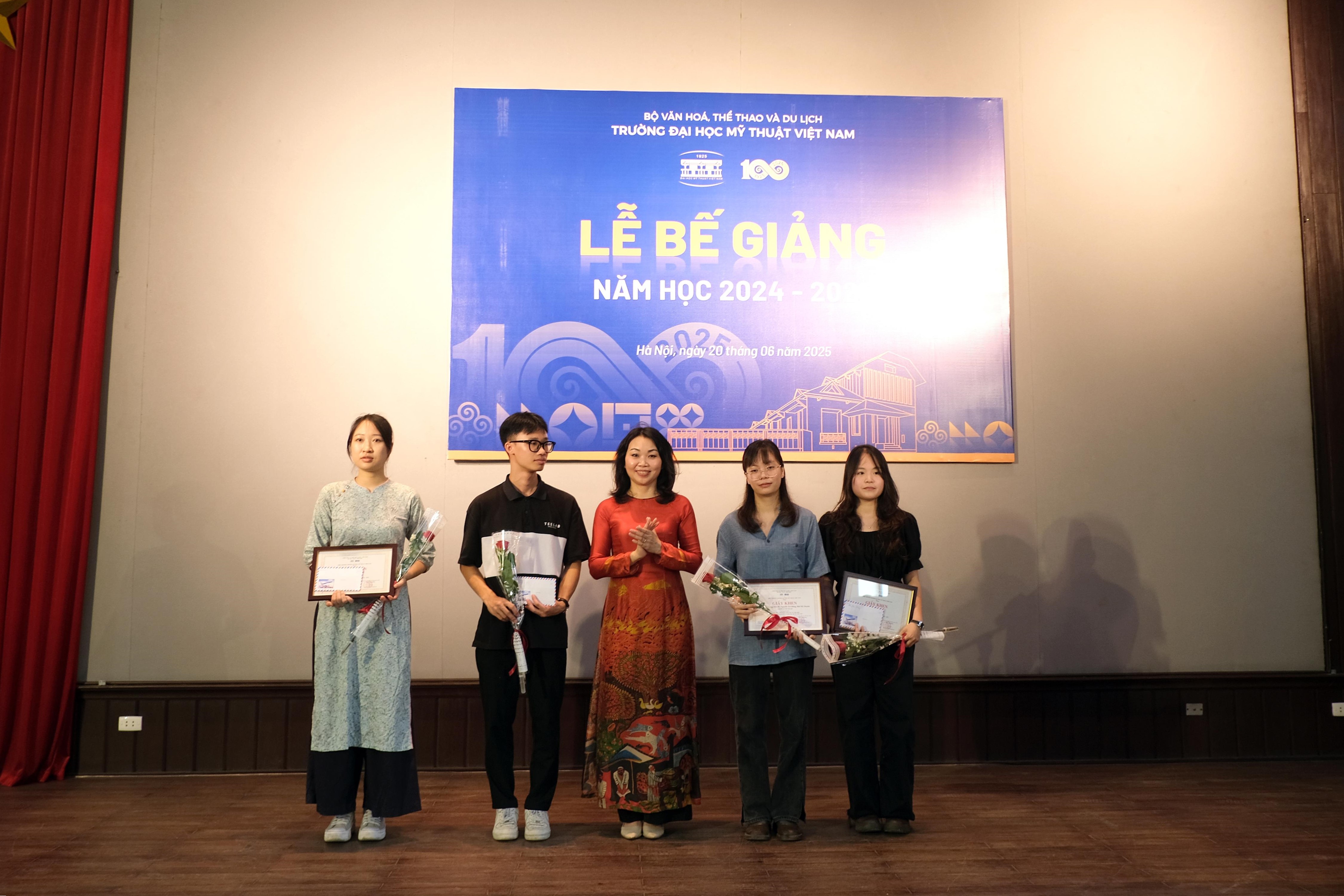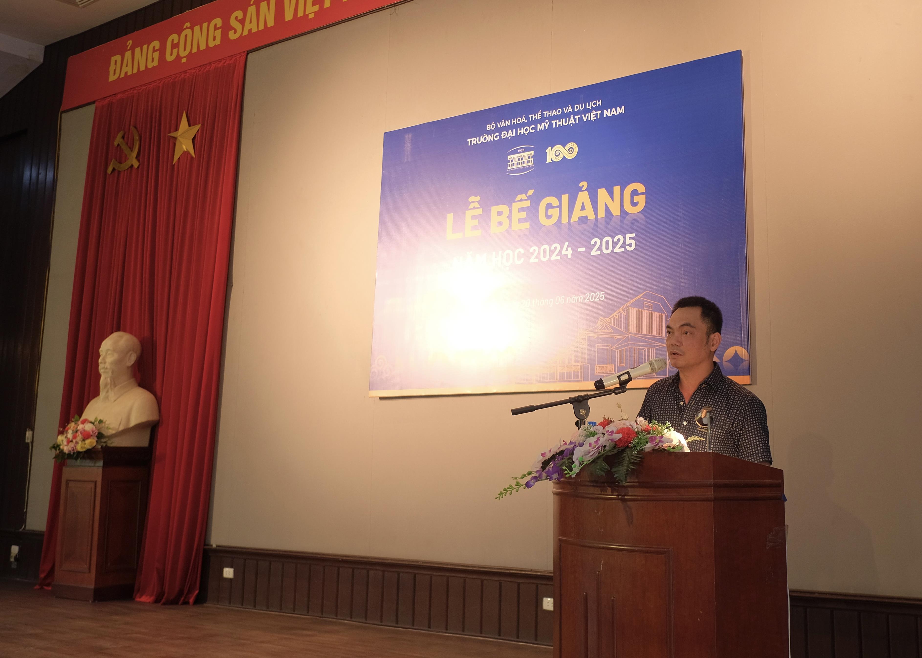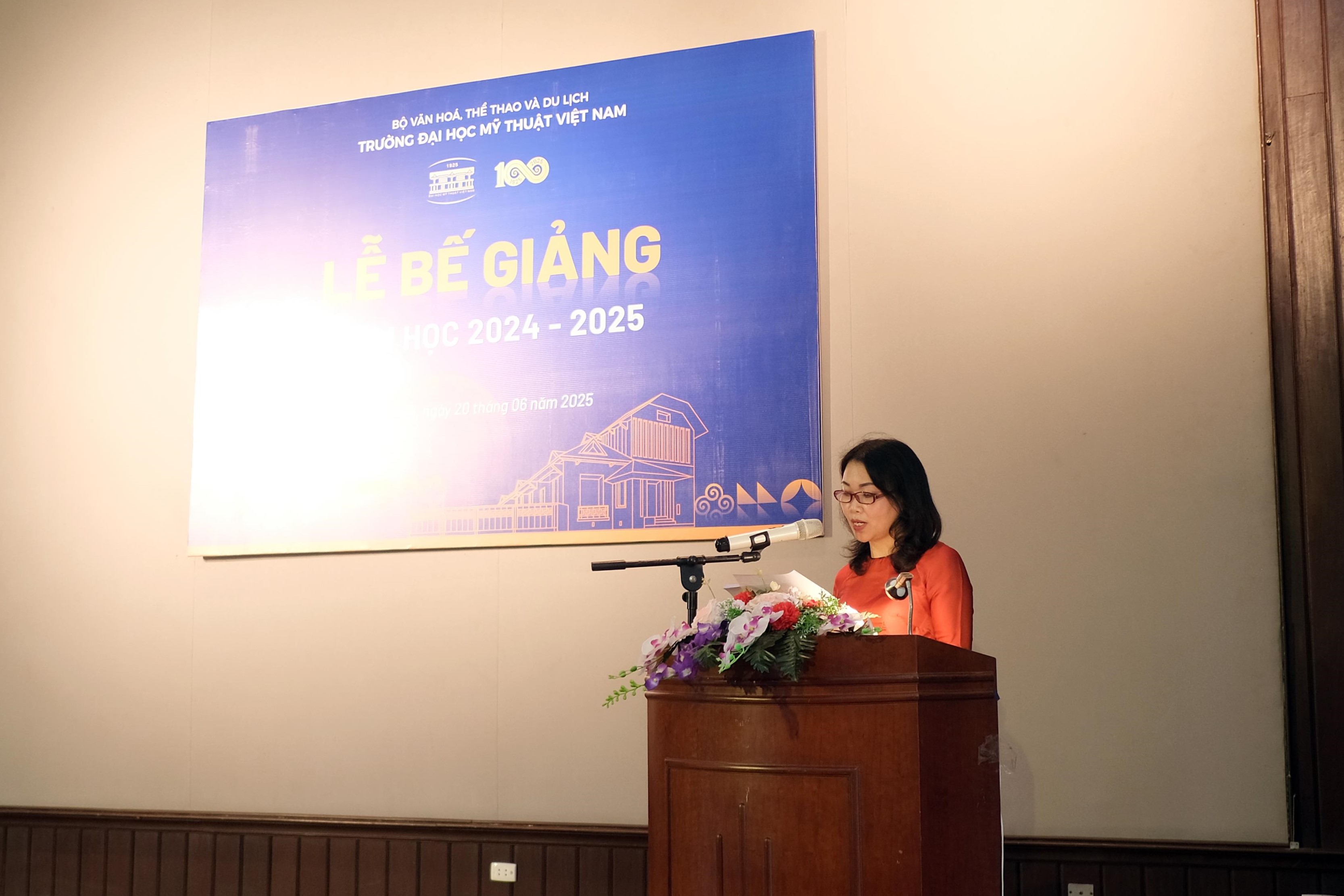 Phát biểu tại buổi lễ, TS. Đặng Thị Phong Lan, Phó bí thư Đảng ủy, Hiệu trưởng Trường Đại học Mỹ thuật Việt Nam đã trình bày bản tổng kết năm học 2024 - 2025, điểm lại các thành tích, kết quả tốt đẹp đã đạt được trong năm học vừa qua; đồng thời, nhìn lại những thiếu sót để khắc phục trong năm học tới - một năm đặc biệt với nhiều sự kiện đầy hứa hẹn, tiếp nối chuỗi các sự kiện Kỷ niệm 100 năm thành lập trường Đại học Mỹ thuật Việt Nam (1925 - 2025).