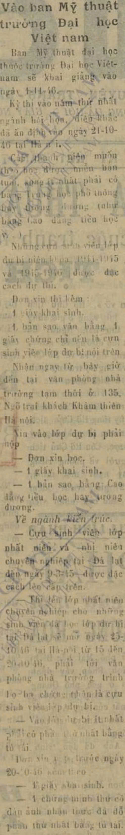 - Trường Cao đẳng Mỹ thuật có tuyển sinh năm 1945 và 1946 nhưng mới tổ chức học được trên một tháng