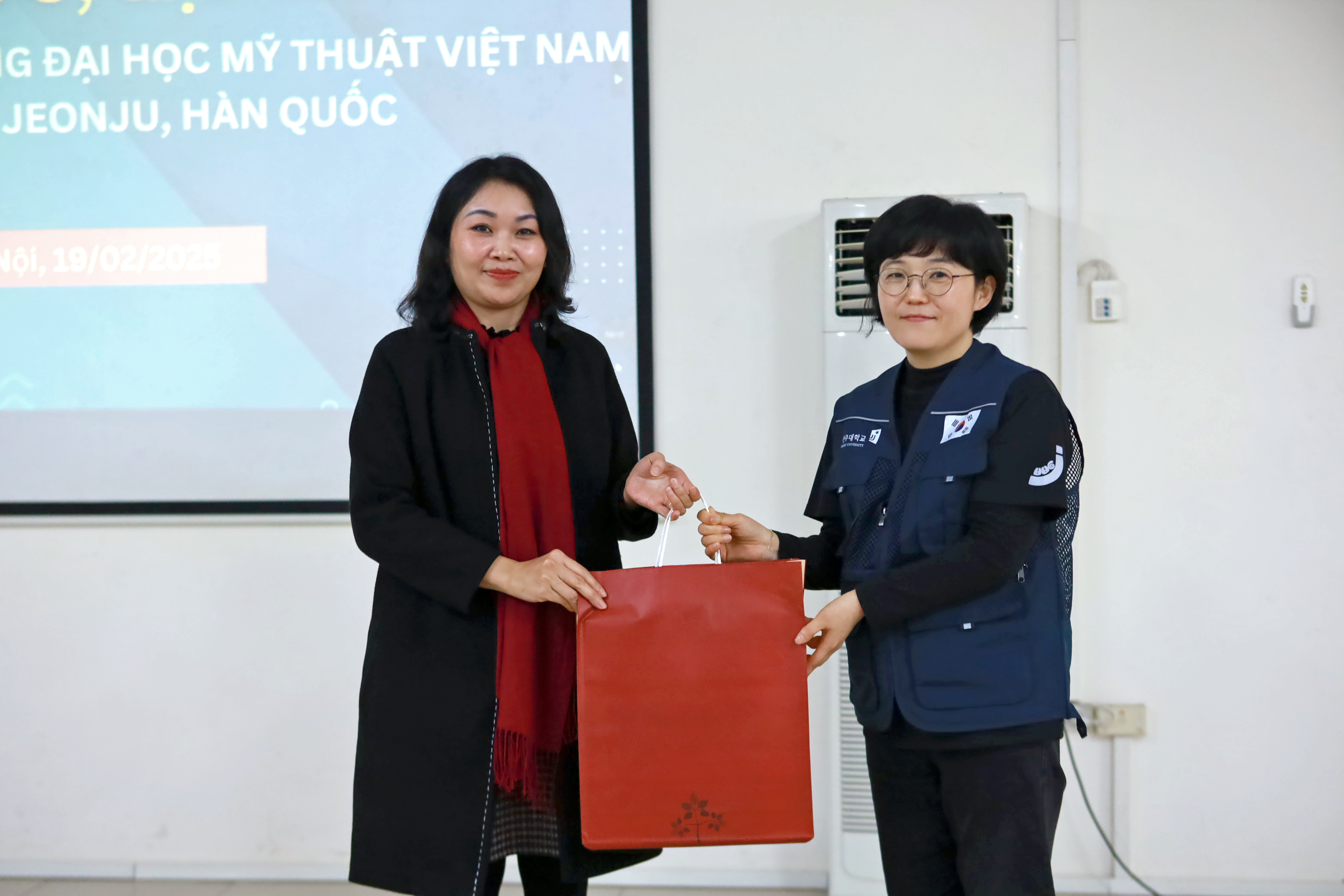 T.S Đặng Thị Phong Lan, Phó Hiệu trưởng Trường Đại học Mỹ thuật Việt Nam trao quà lưu niệm cho bà Hwang Myungrang, Trường Đại học Jeonju, Hàn Quốc
