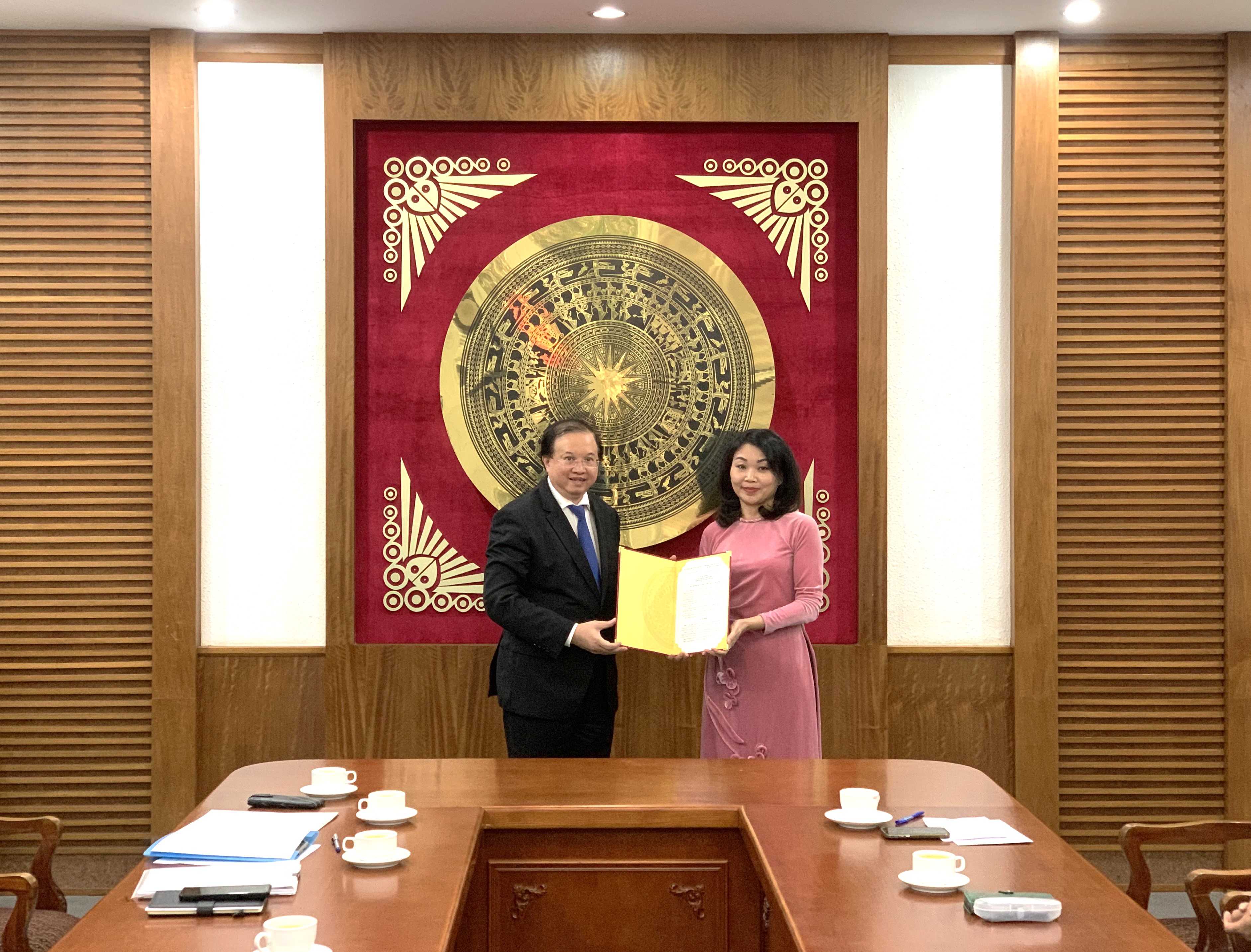 Đồng chí Tạ Quang Đông - Phó Bí thư thường trực Đảng ủy Bộ, Thứ trưởng Bộ Văn hóa, Thể thao và Du lịch trao Quyết định công nhận chức danh Hiệu trưởng Trường Đại học Mỹ thuật Việt Nam đối với Tiến sĩ Đặng Thị Phong Lan và tặng hoa chúc mừng.