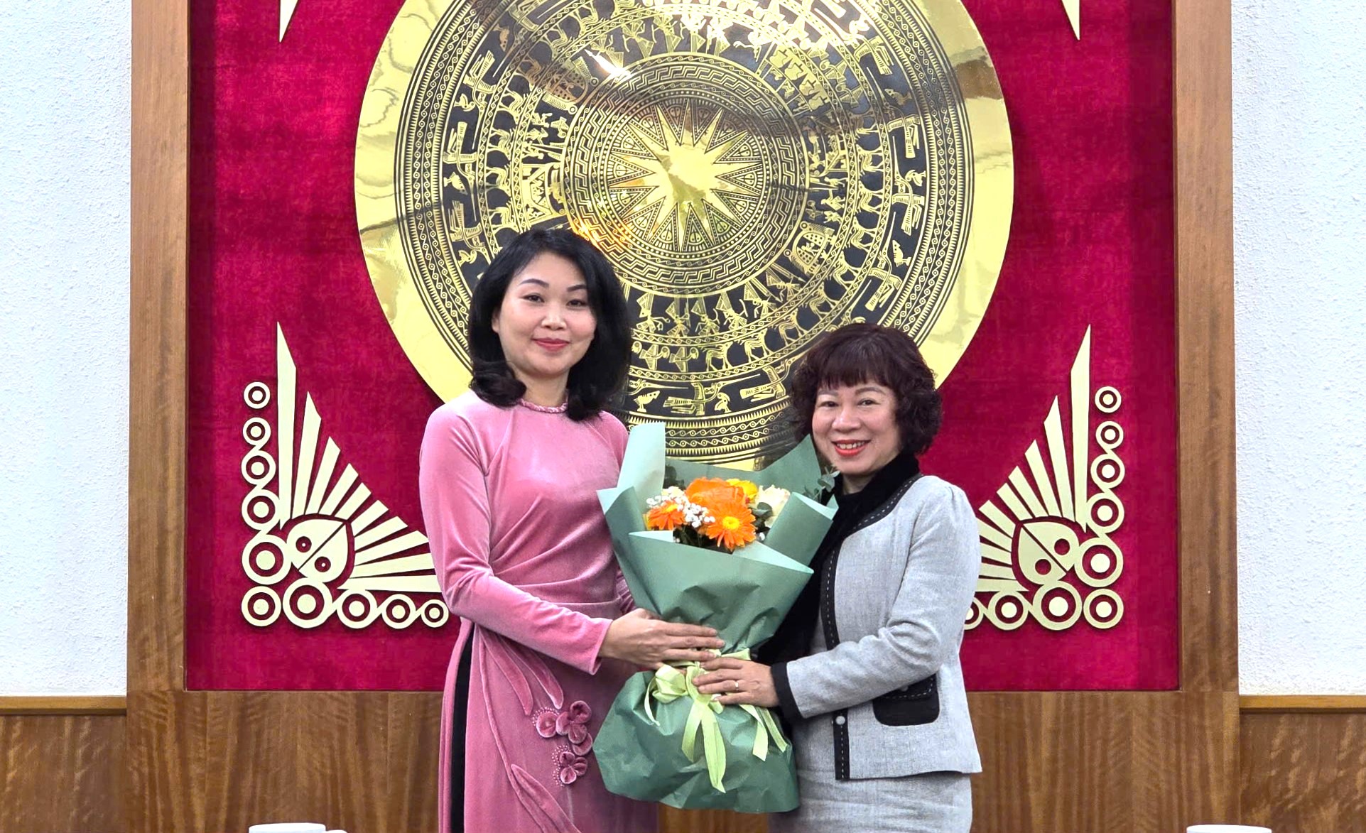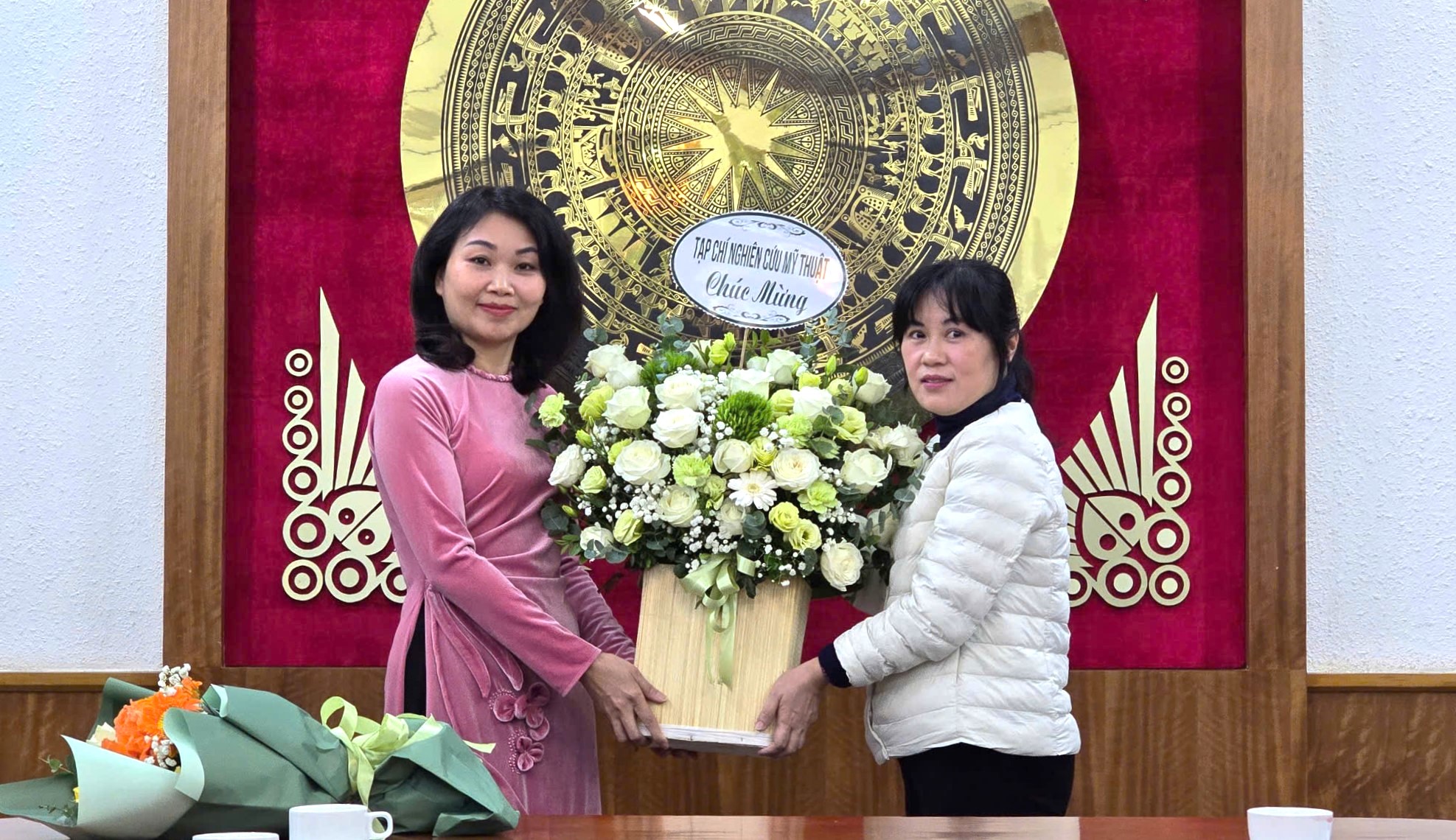 Đồng chí Hoàng Thị Đào – Tổng Biên tập tạp chí Nghiên cứu mỹ thuật tặng hoa chúc mừng.