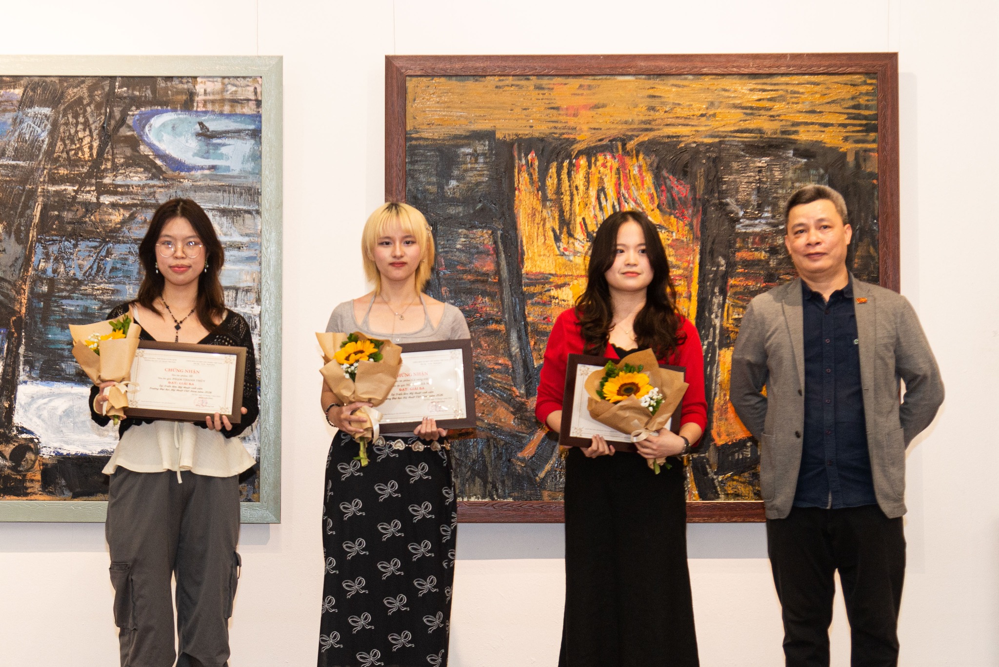 TS. Triệu Khắc Tiến, Phó Trưởng khoa Hội họa, Đại diện Đảng ủy nhà trường trao Giải Khuyến khích cho các tác giả.