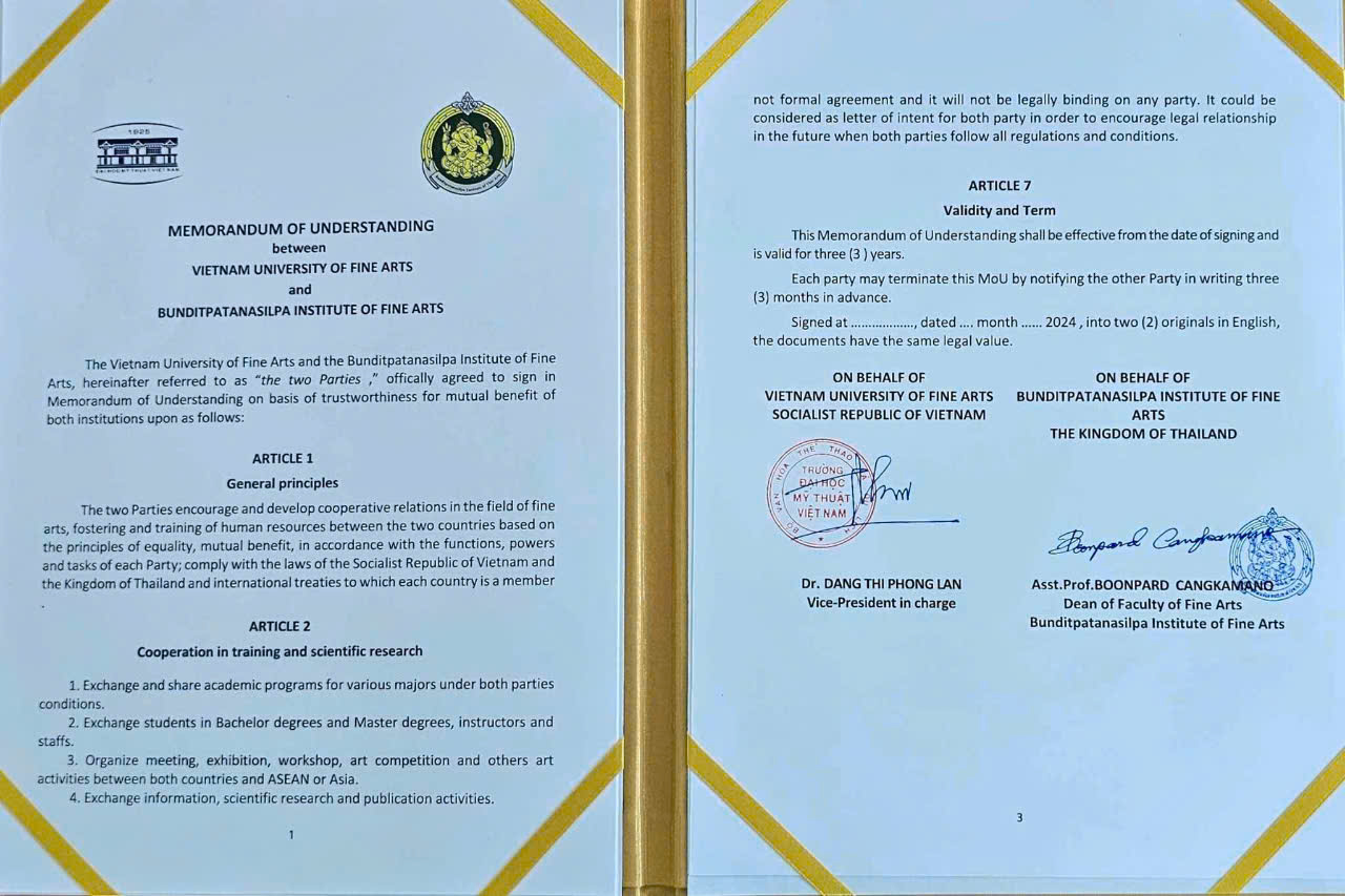 Biên bản ghi nhớ giữa Trường Đại học Mỹ thuật Việt Nam và Viện Mỹ thuật Bunditpatanasilpa Thái Lan bao gồm các nội dung hợp tác chính: