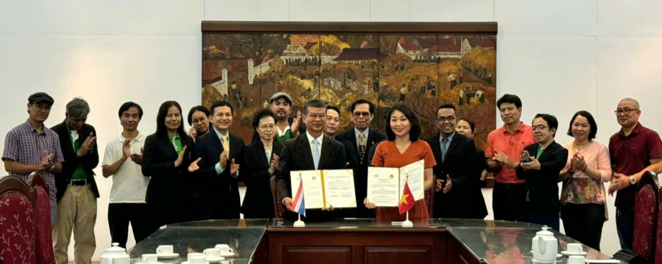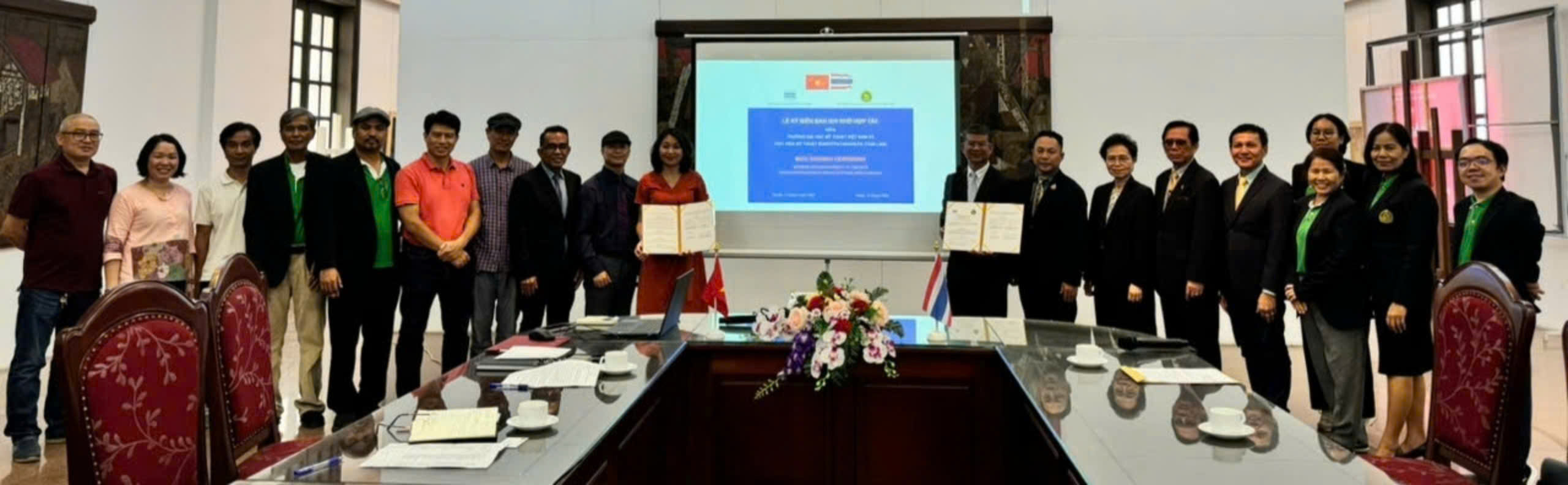 Ngày nay, việc hợp tác quốc tế trong lĩnh vực giáo dục nghệ thuật đóng vai trò vô cùng quan trọng trong việc phát triển, chia sẻ tri thức và nâng cao chất lượng đào tạo. Để khẳng định cam kết này, Trường Đại học Mỹ thuật Việt Nam và Viện Mỹ thuật Bunditpatanasilpa Thái Lan đã long trọng tổ chức Lễ ký kết Biên bản ghi nhớ hợp tác nhằm thúc đẩy mối quan hệ hợp tác giữa hai bên.